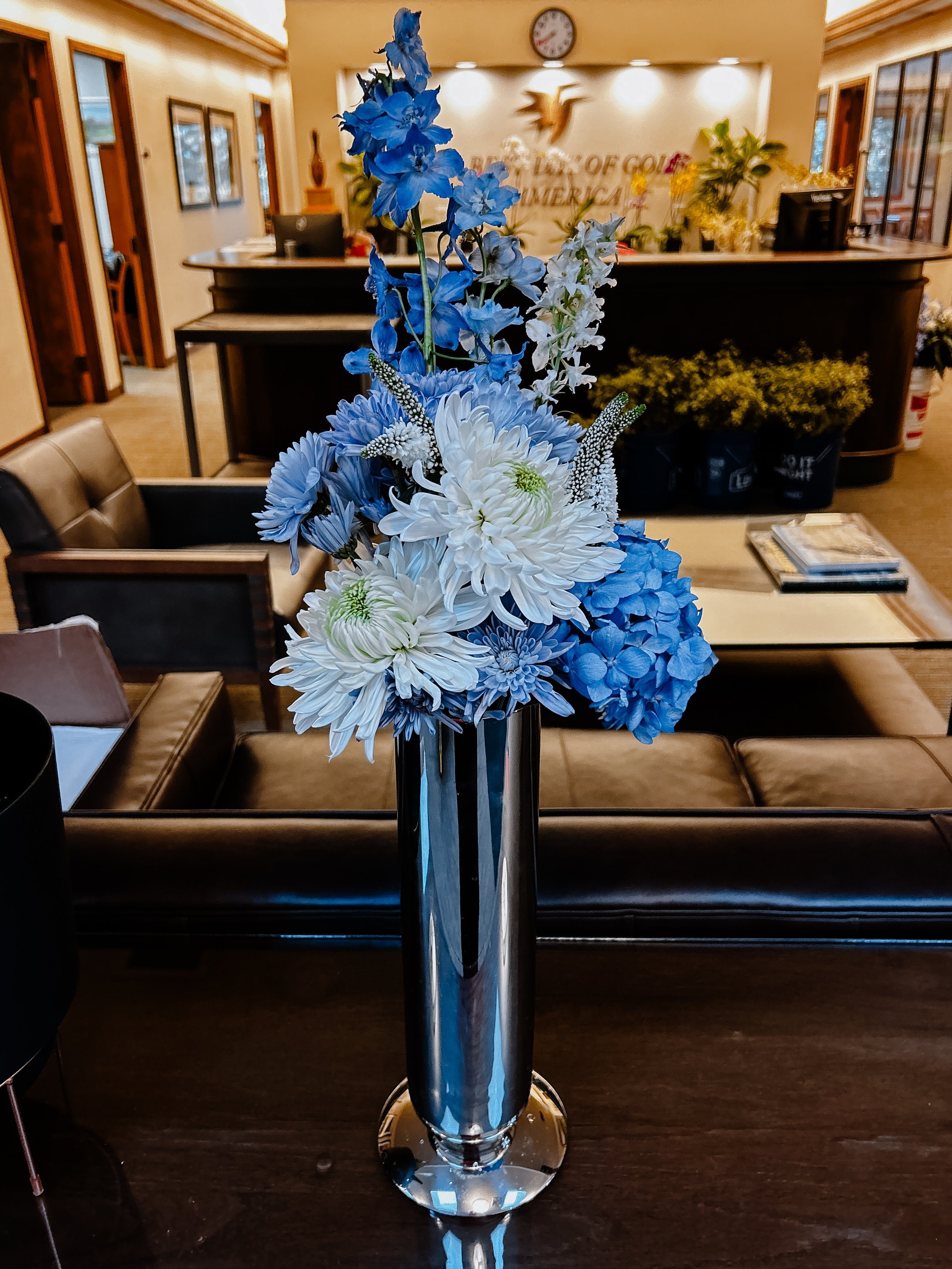 For the 2024 BMW PGA Golf Championship at Castle Pines, I was part of a three-person floral team responsible for designing and preparing hundreds of arrangements in a white, blue, and purple color palette to reflect the BMW brand. We spent a full week prepping the florals and I remained on call throughout the event to ensure every arrangement stayed fresh, vibrant, and event-ready.